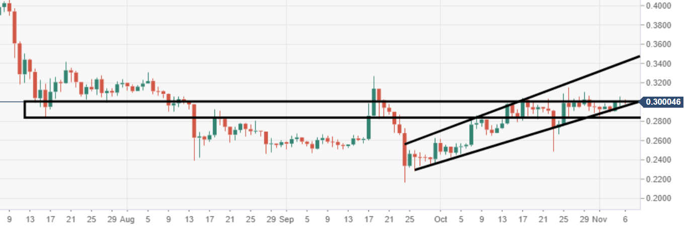 The bulls continue to flirt with the big $0.3000 mark, yet to conquer.