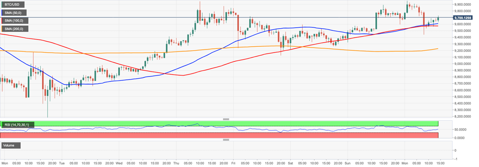 Bitcoin (BTC) has extended the recovery from the intraday low into the US opening. At the time of writing, BTC/USD is changing hands above $9,700, mostly unchanged both on a day-to-day basis and since the beginning of Monday. On the intraday charts, BTC is supported by 1-hour SMA50 (currently at $9,600), while the ultimate bullish target is created by a psychological $10,000.