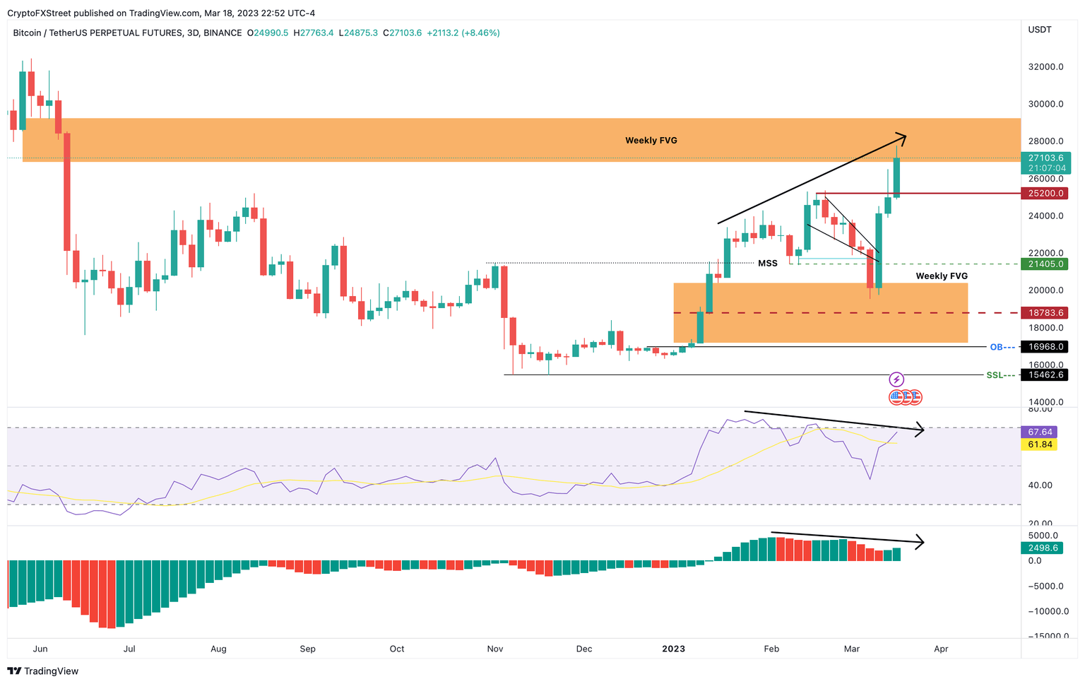 Bitcoin price has experienced a quick rally after dipping into the weekly inefficiency to the downside. As a result, the second leg of the uptrend began in March, pushing BTC to nine-month highs and another inefficiency to the upside. However, the big crypto seems to be developing a divergence on the three-day chart, which could be an opportunity to accumulate or sell-signal for bears. But as the banking crisis deepens, this move could affect the BTC’s next move.