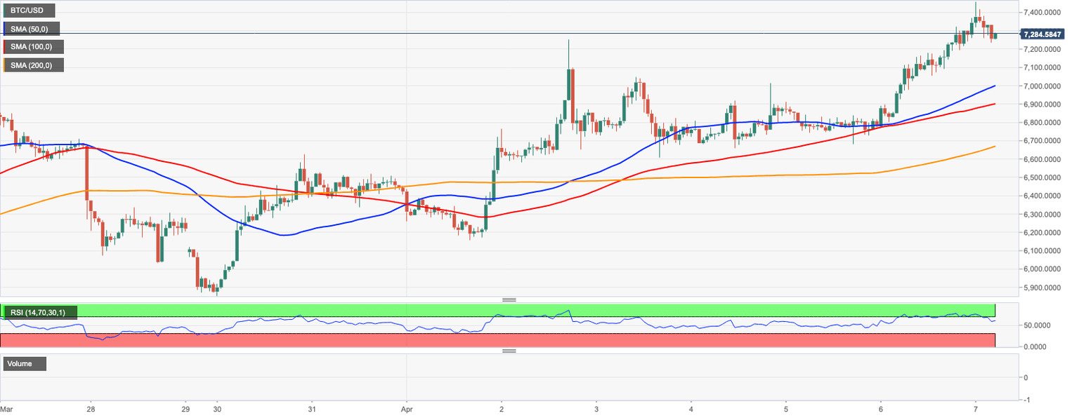 BTC/USD hit the intraday high at $7,460 and retreated to $7,270 by press time. Despite the downside correction, the coin is moving within a short-term upside trend amid low volatility. BTC/USD has gained nearly 5% since this time on Monday as the cryptocurrency market is on the recovery path.