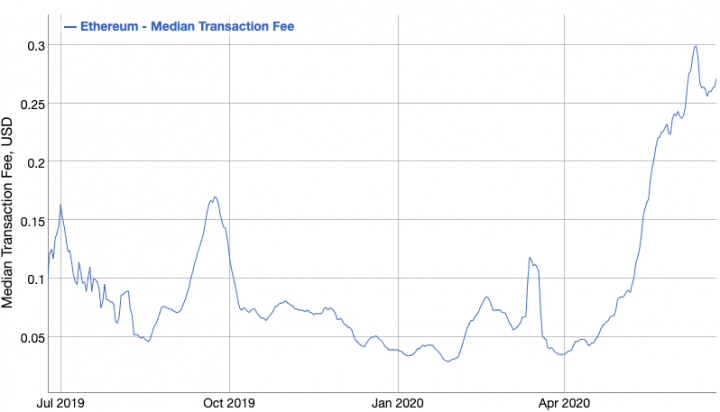 Bitcoin is currently trading at $9,300 after a peak of $9,670. Bulls couldn’t defend the daily 12-EMA at $9,463 or the 26-EMA at $9,444. The next support level is established at $9,170 as the last higher low of the current uptrend.