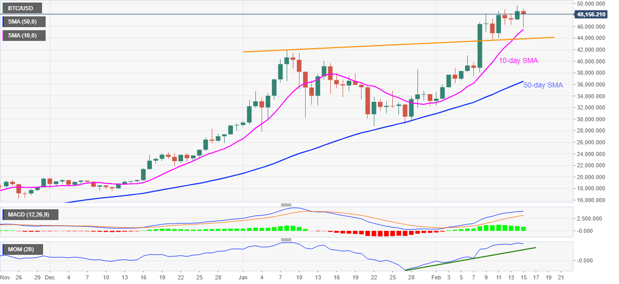 Bitcoin bulls roll-up their sleeves to attack the record top of $49,700 while picking up the bids near $48,190 during the early Tuesday’s trading. In doing so, the cryptocurrency major extends the previous day’s U-turn from a one-week low, around the 10-day SMA, while staying above an upward sloping trend line that connects January’s top and Wednesday’s bottom.