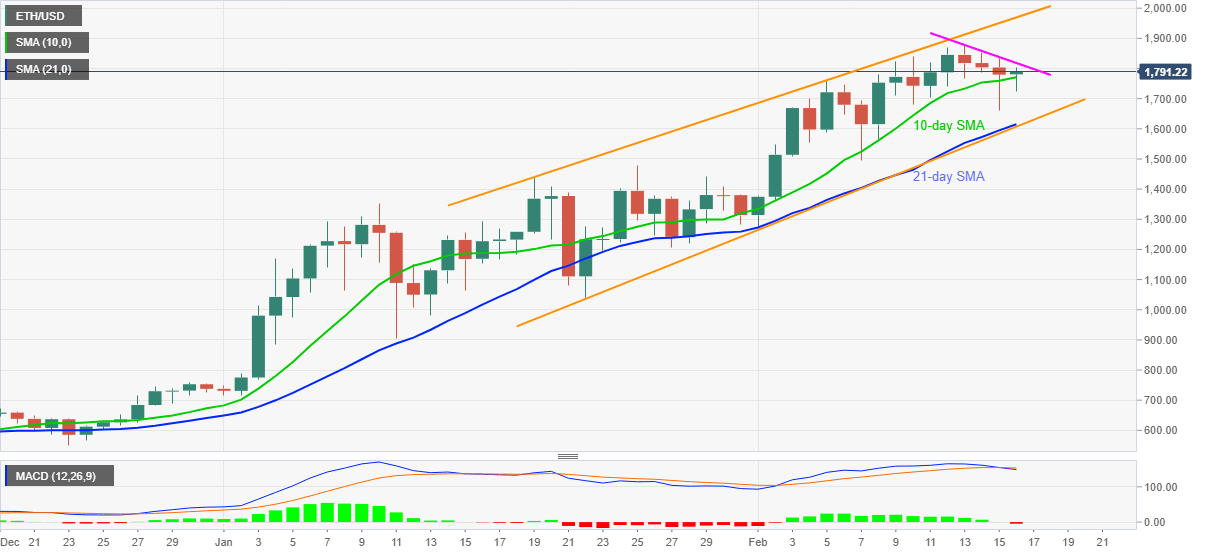 Ethereum is preparing for a bullish breakout while taking the bids near $1,795 amid the initial Tuesday. In doing so, the altcoin rises for the first time in the last four days while attacking the latest lower-high formation on the daily (D1) chart.