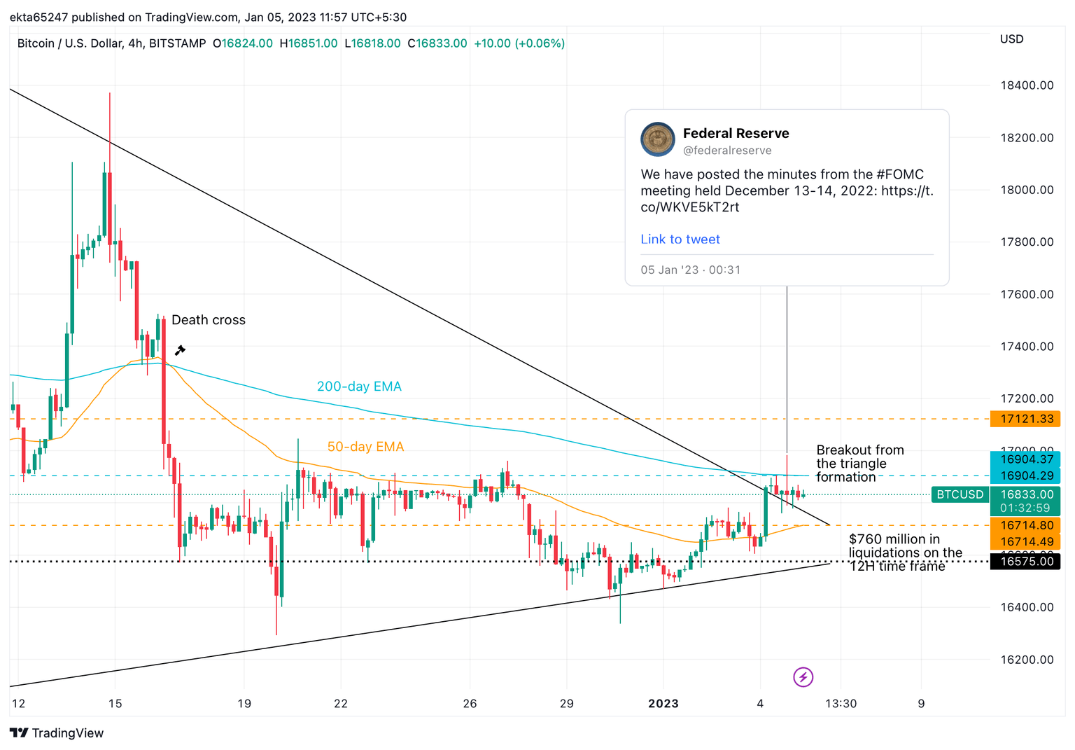 Bitcoin price began the Asian trading session flat, BTC changed hands at $16,815 based on data from CoinGecko. The recently released minutes from the Federal Open Market Committee December meeting did not paint a clear picture of what the majority of traders were expecting.