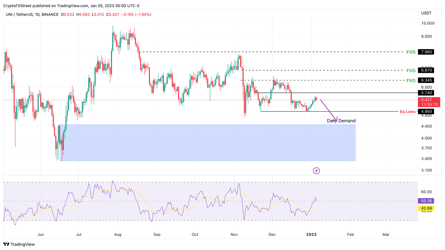 Uniswap price has bounced off the $4.95 support level thrice since November 21, 2022, and has created a set of equal lows here. As a result of the importance of this level, there is sell-stop liquidity resting below it.