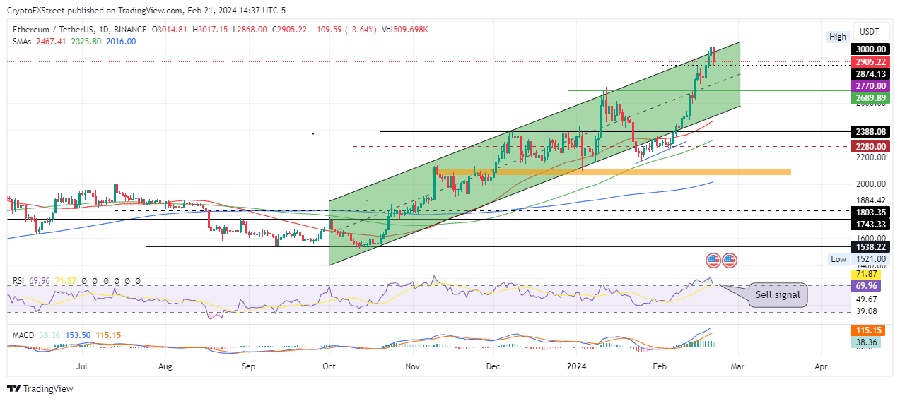 Ethereum (ETH) price, like BTC, is responding to a sell signal executed on the RSI. Traders heeding this call could see ETH drop 5% to the $2,770 support, coinciding with the midline of the ascending parallel channel. The paling MACD histogram bars accentuate this bearish thesis, solidified by the topped out MACD which is now deviating south.