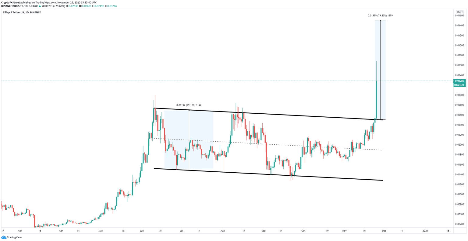 On November 24, Zilliqa price had an initial small breakout above the parallel channel at $0.0251 with a ton of follow-through in the following 24 hours exploding towards a high of $0.036 and still aiming to hit $0.045.