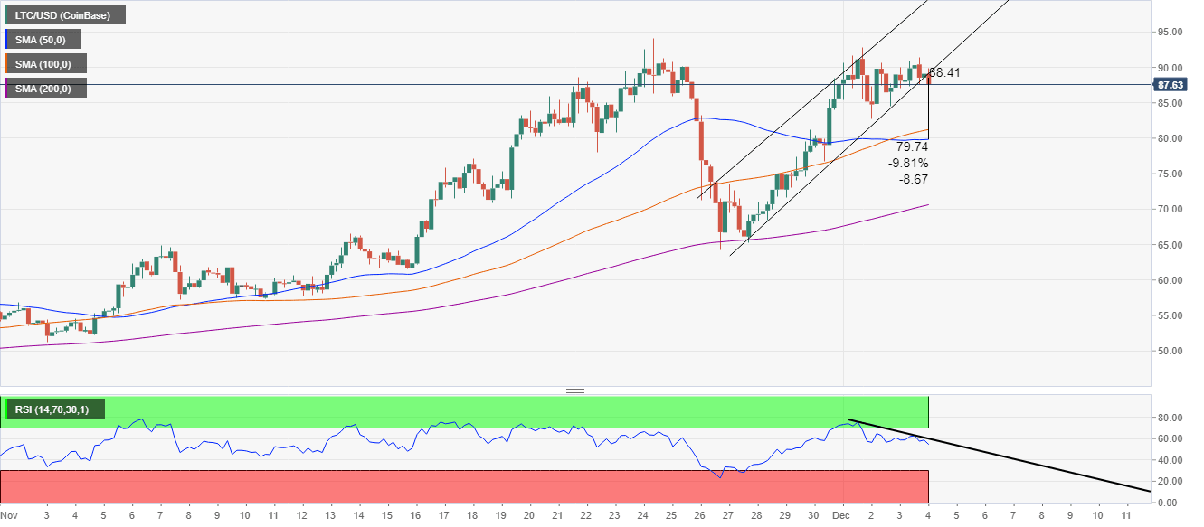 Litecoin refreshed the highs above $90 but left $100 untouched. The failure to sustain the uptrend has led to a drop below $90. LTC/USD is teetering at $88 amid bearish signals favoring losses eyeing $80. LTC has dived under the ascending parallel channel on the 4-hour chart.