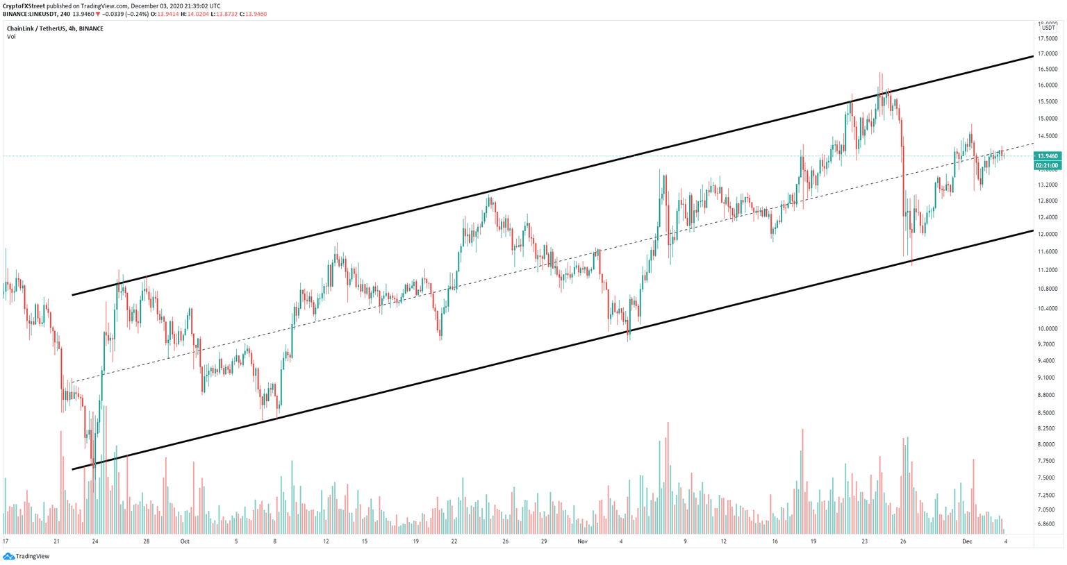 Chainlink price is bounded inside a major ascending parallel channel formed since September 23. Unlike most of the top cryptocurrencies, Chainlink established its all-time high in August 2020 at around $20. The digital asset plummeted to $7.4 before recovering and touching $16,39 on November 24.
