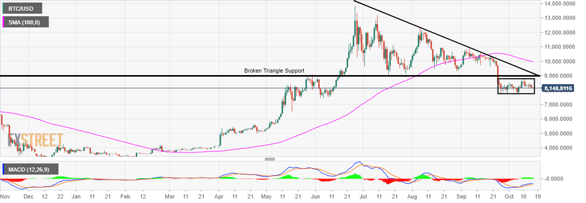 Bitcoin price is still suffering the effects of breaking the falling triangle support as observed on the daily chart. Besides, the descending trendline resistance continues to limit movement to the north.