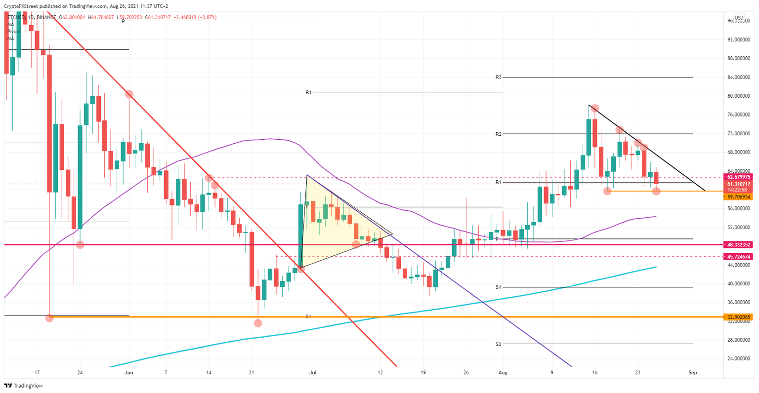On August 16 and again on August 23, Litecoin (LTC) tried to reach the 200-day Simple Moving Average (SMA). Both tests failed and what followed each time was a quick reversal. After August 16, the green ascending trend line, originating from July 21, could provide enough support for buyers to stay in the rally and build up momentum for a second attempt.