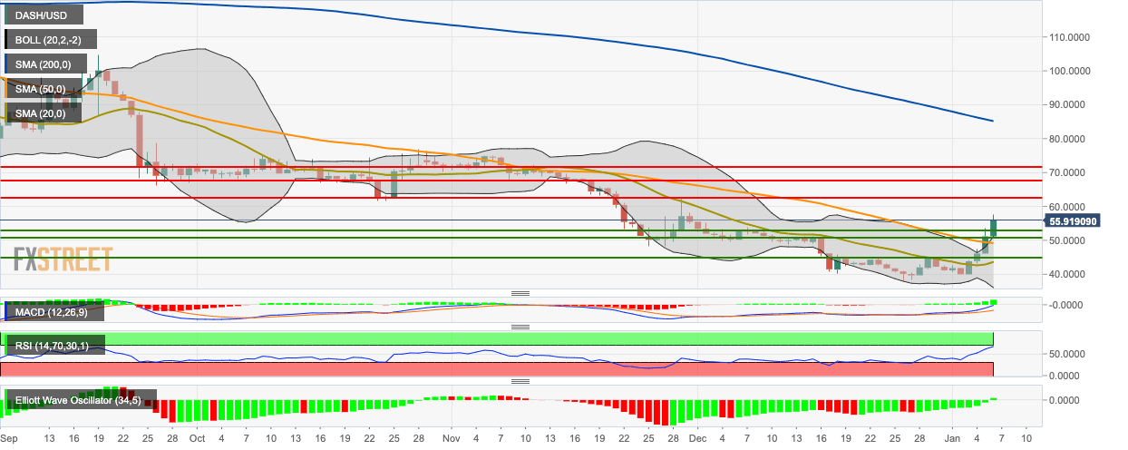DASH/USD bulls have remained in control for the fourth straight day, taking the price from $51.25 to $56. In this four-day period, the price has jumped by 39.45%. The 20-day Bollinger jaw has widened, indicating increasing price volatility. The price is hovering above the 50-day SMA 50 curve and 20-day Bollinger Band.