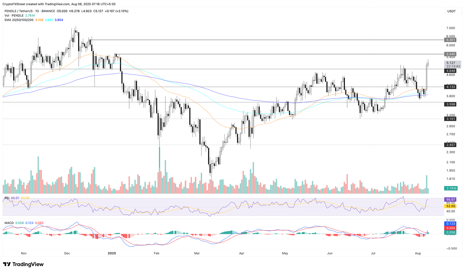 Pendle edges higher by over 2% at press time on Friday, extending the 25% surge from Thursday. The recovery run hits the highest price since January 7, targeting the year-to-date high of $5.59. The Moving Average Convergence Divergence (MACD) line crosses above its signal line, flashing a buy signal as bullish momentum resurfaces. The Relative Strength Index (RSI) stands at 66 on the daily chart, rising towards the overbought zone, which indicates heightened buying pressure.