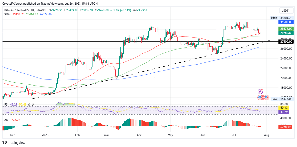 Bitcoin price remained in a range it has been bobbing around in for most of the week, trading at $29,353 at the time of writing, slightly up after a minor jerk down following the Fed’s July meeting announcement.