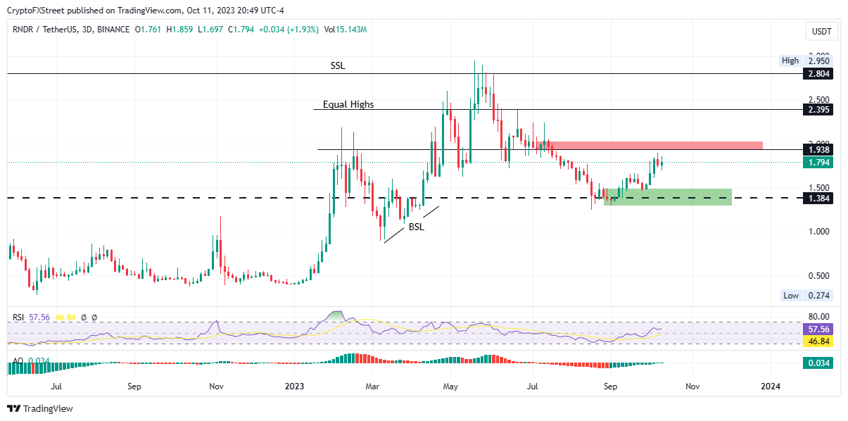 Render token (RNDR) price is up 30% since September and 20% up so far in the month with no signs of stopping. With bulls still taking the lead, RNDR is confronting a supply barrier between $1.938 and $2.035, the supply zone, where aggressive selling is expected. A test of this order block would constitute a 10% surge above current levels.