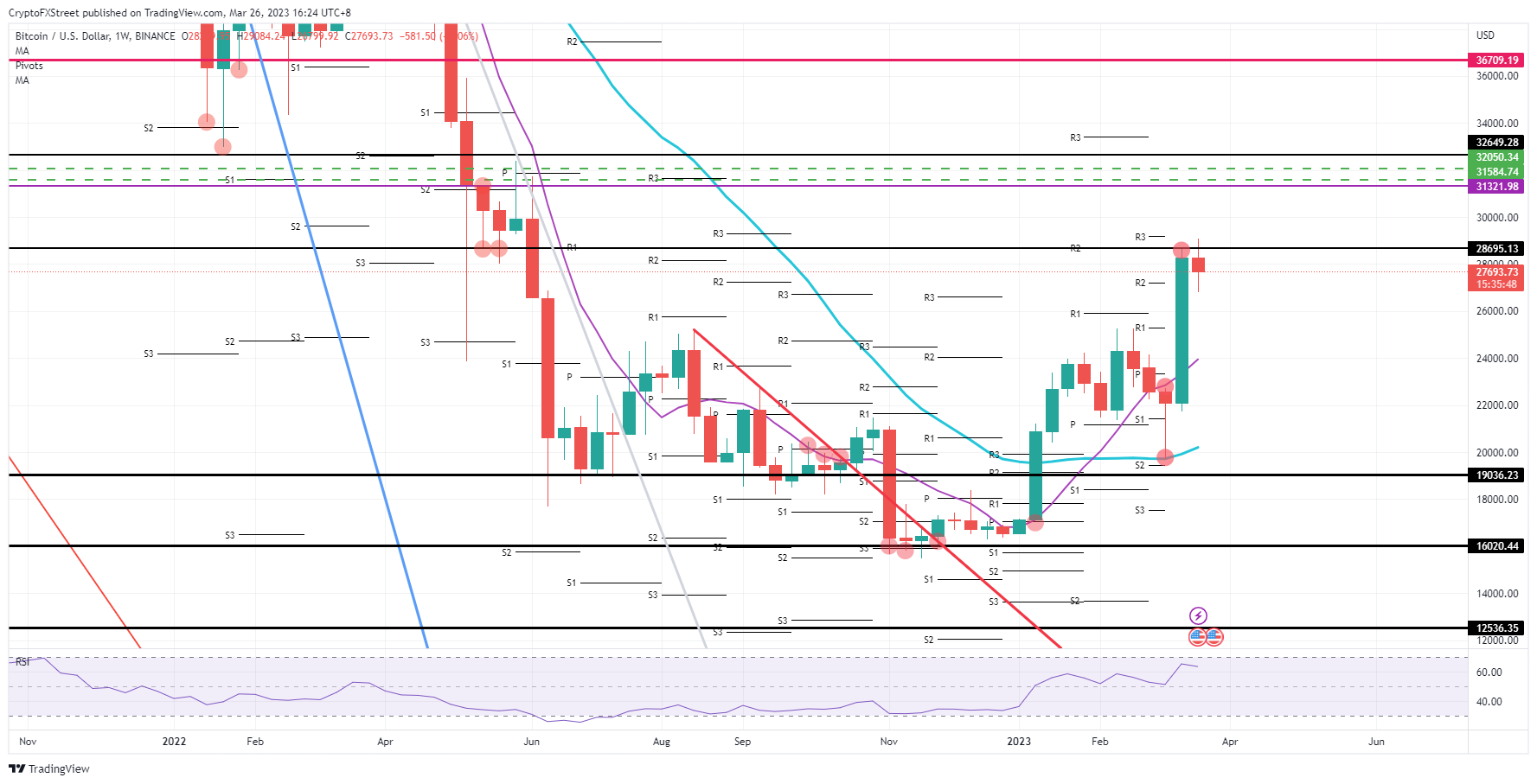 Bitcoin (BTC) price has had a stellar performance last week with over 28% gains in its books. Bulls however saw their dream crushed of $30,000 as $290,000 brought a firm rejection and bulls have been unable to trade back at that level ever since. Expect going into next week to see another leg lower in the fade toward $25,300 as a support level.