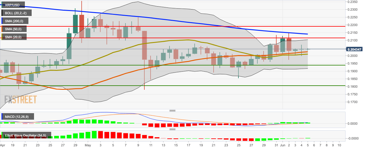 XRP/USD bulls remained in control for the third straight day as the price went up slightly from $0.2042 to $0.2043. The Elliott Oscillator is back in the green following a red session, showing that the market sentiment is slightly bullish. The MACD indicates sustained bullish momentum.