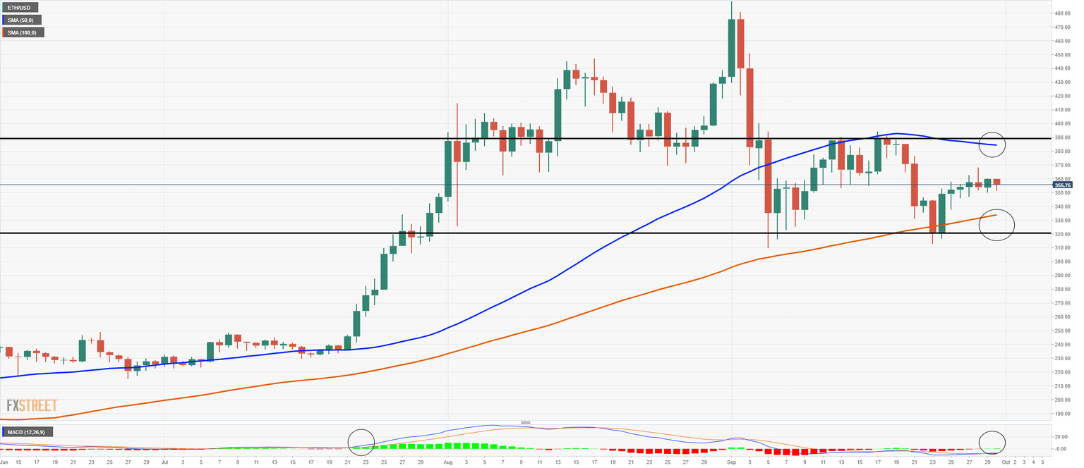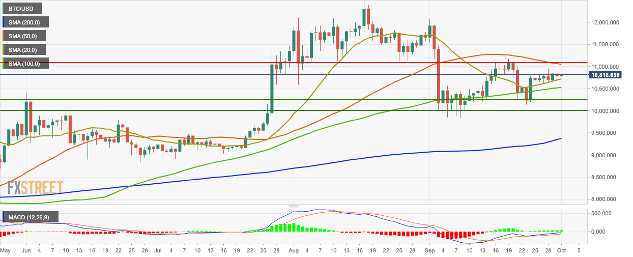 The premier cryptocurrency remains limbo as it trends between $10,825 and the SMA 20 curve. While the MACD shows sustained bullish momentum, it seems unlikely that the buyers will be able to push the price above the $11,075 resistance line and the SMA 50 curve.