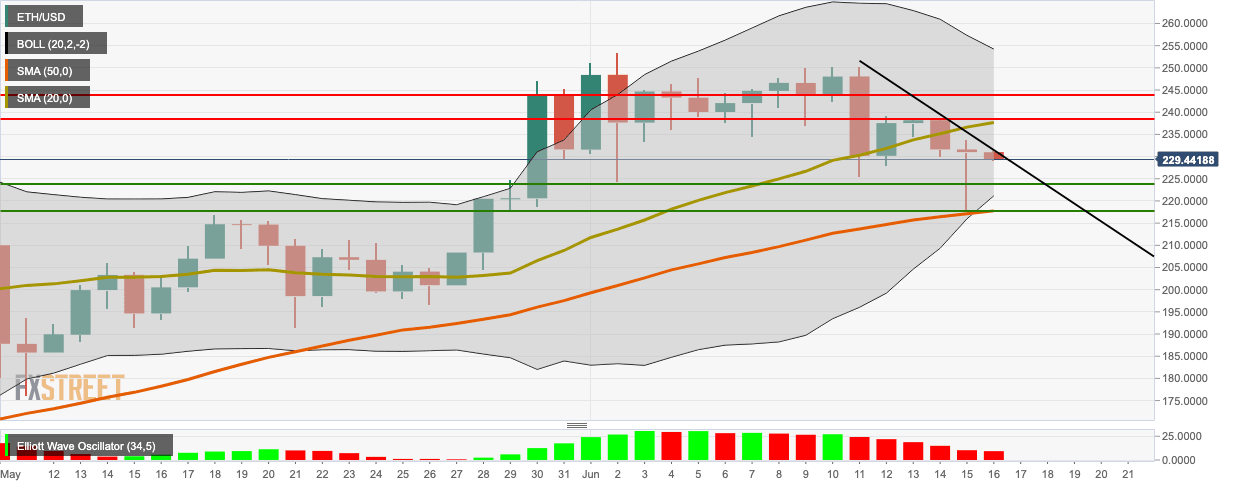 ETH/USD dropped from $231 to $229.80, following three straight bearish days. The price is currently sandwiched between SMA 20 and SMA 50 curves. The 20-day Bollinger Band has narrowed, indicating decreasing price volatility. Finally, the Elliott Oscillator has had six straight red sessions, showing sustained bearish sentiment.