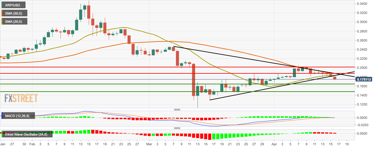 XRP/USD charted its fourth consecutive bearish day, as the price dropped from $0.1806 to $0.176 in the early hours of Thursday. In the process, the price dropped below the triangle formation and the SMA 20. The bulls will need to garner enough momentum to break above the upward trending line to reverse bearish sentiment.