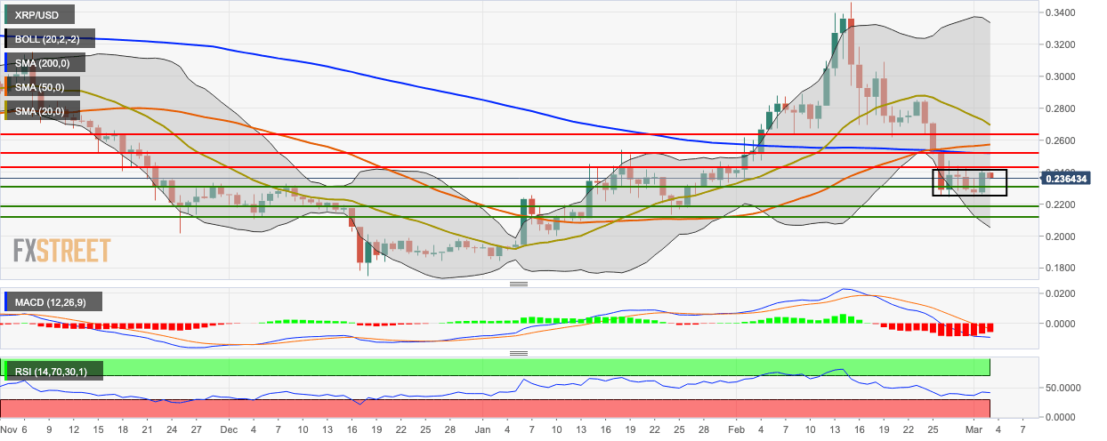 XRP/USD bears managed to take control of the market in the early hours of Tuesday as the price dropped from $0.24 to $0.237. This follows a heavily bullish Monday where the price went up from $0.227 to $0.24. The price is hovering below the SMA 20, SMA 50 and SMA 200 curves and is consolidating under the $0.24-mark.