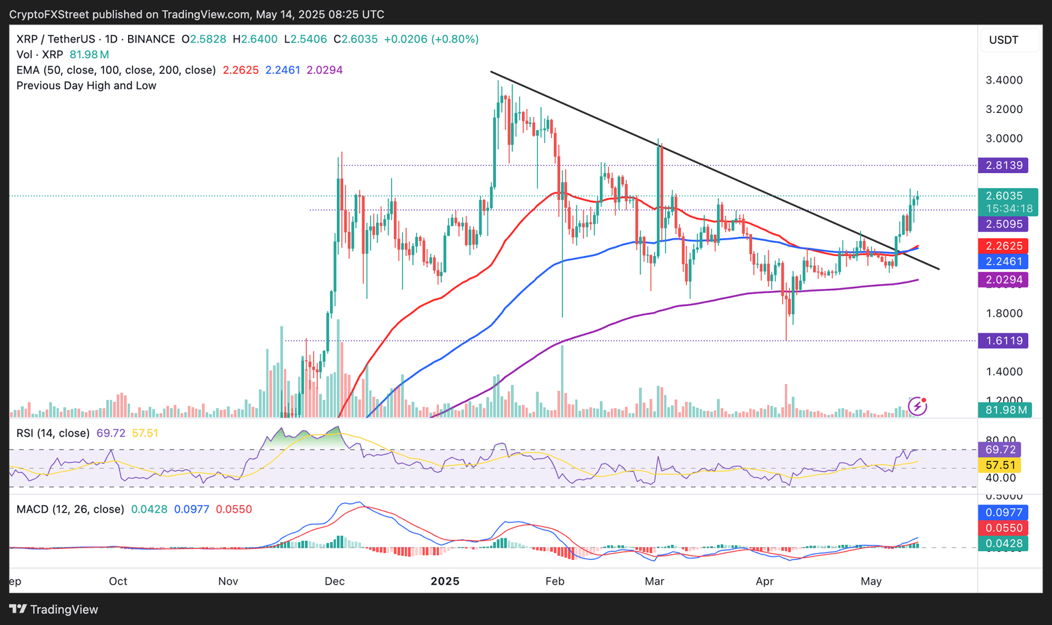 Ripple’s (XRP) price trades broadly stable at around $2.60 on Wednesday, upholding the recent bullish trend as crypto markets cheer amid improved sentiment. The uptrend, now in its second consecutive week of gains, is bolstered by a surge in XRP futures Open Interest (OI), growing by more than $1 billion, signaling increasing trader confidence and adding to the chances of a potential breakout above $3.00.