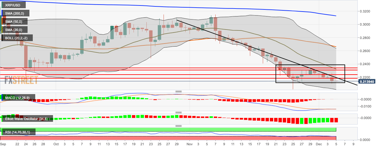 XRP/USD has dropped slightly from $0.214 to $0.213 in the early hours of Thursday. The daily price has repeatedly been thwarted by the resistance provided by the downward trending line. The price is floating below the 200-day Simple Moving Average (SMA 200), SMA 50 and SMA 20 curves.