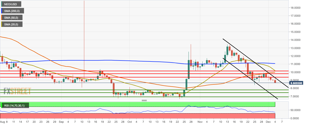 NEO/USD has fallen from $9.75 to $8.75, dropping by 10.25% over the last five days. The daily price is trending in a downwards channel formation and floating below the 200-day Simple Moving Average (SMA 200), SMA 50 and SMA 20 curves. The Relative Strength Index (RSI) indicator is around 36.
