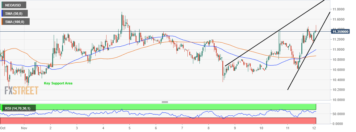 NEO bears are waking to a rude shock having found the bulls full in control of the throttle. NEO is in the initial stages of flying the bullish flag high above the crypto horizon. Besides, the price is already 2.45% higher on the day. A rising wedge pattern suggests that NEO will reverse the trend, possible stop at $11.40.