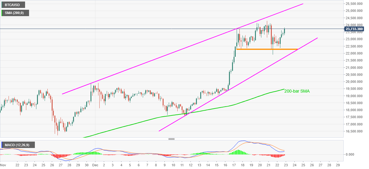 BTC/USD rises to 23,733 during the early Wednesday’s trading. In doing so, the crypto major extends gains from a horizontal area comprising multiple lows since December 07, marked the previous day.
