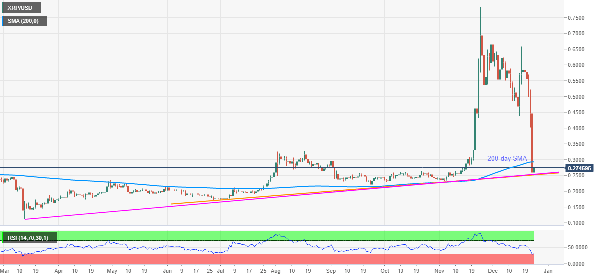 XRP/USD eases from the intraday top near 0.3058 to 0.2730 during early Thursday. In doing so, the Ripple pair fails to keep the bounce off key support lines while taking a U-turn from 200-day SMA.