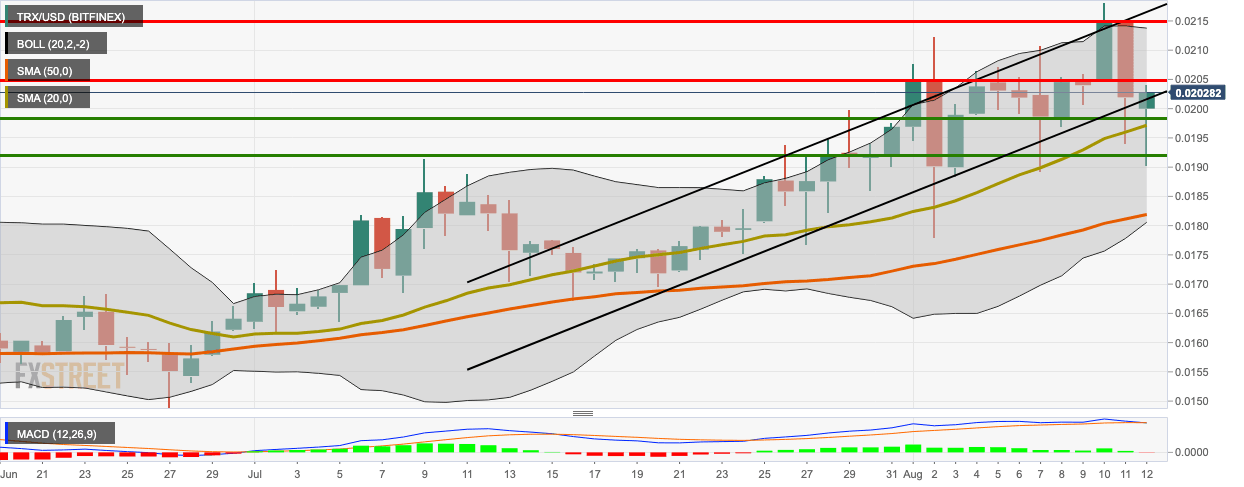 TRX/USD bulls re-entered the market following a heavily bearish Tuesday. The price has gone up from $0.0199 to $0.0203. In the process, the price has crept back into the upward channel formation. The Moving Average Convergence/Divergence (MACD) shows that market momentum has reversed from bullish to bearish.