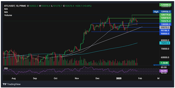 During Monday’s DeepSeek tech stock rout, Bitcoin fell to a low of 97,750 as it tracked the tech sector lower. However, its swift recovery from a key technical support is encouraging. Traders bought the dip, helping Bitcoin rise over 5.7% from its low point, outperforming the Nasdaq and the S&P 500.