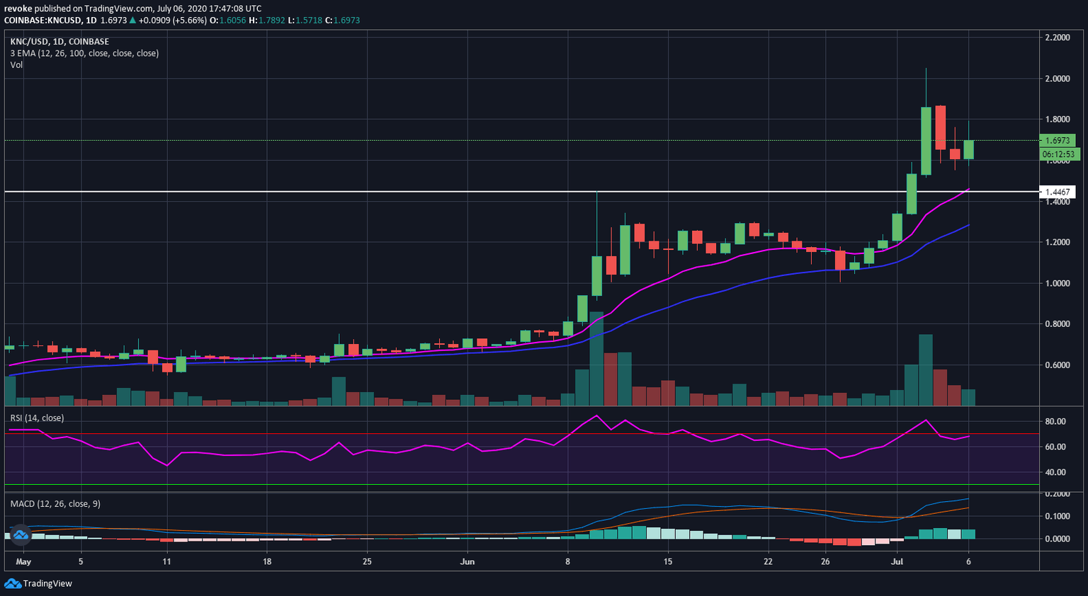 Kyber Network has been outperforming basically the entire crypto market for the past month. On July 3, KNC/USD hit a new 2020-high at $2.05, a level not seen since May 2018. After two days of healthy consolidation, KNC bulls are back and eying up $2 again.