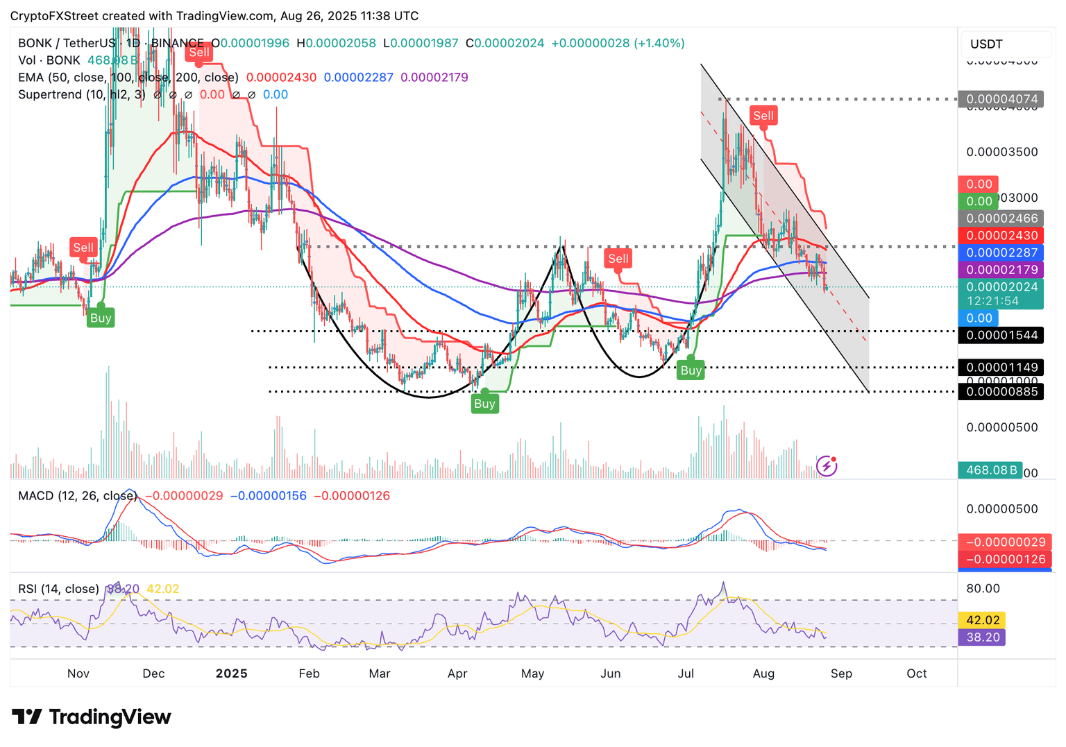 Bonk (BONK), a Solana-based meme, offers recovery signs, up 2% on Tuesday and marking a knee-jerk bounce after extending its downtrend below the critical $0.000020 level. The token peaked at around $0.000040 in July, marking a local top.