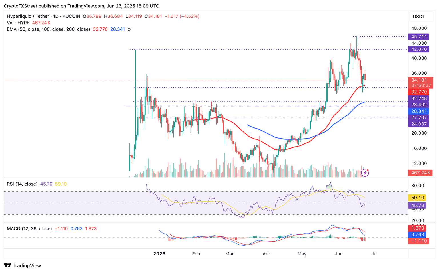 Hyperliquid (HYPE) has maintained a prolonged downtrend since reaching its new all-time high (ATH) of around $45.71. The Middle East tensions-triggered crash over the weekend extended HYPE’s pullback 32% below the ATH. Support at $30.00 proved helpful, providing liquidity for the upswing that tested resistance at $37.00 before correcting to trade around $34.15 at the time of writing.