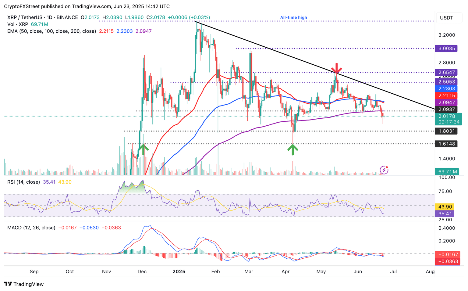 Ripple (XRP) faces increasing downside pressure as it trades slightly above $2.00 at the time of writing on Monday. The sell-off over the weekend followed United States (US) strikes on Iran on Saturday, triggering massive liquidations. XRP is currently constrained between support at $2.00 and resistance at $2.09 after bouncing from lows of $1.90, reached on Sunday.