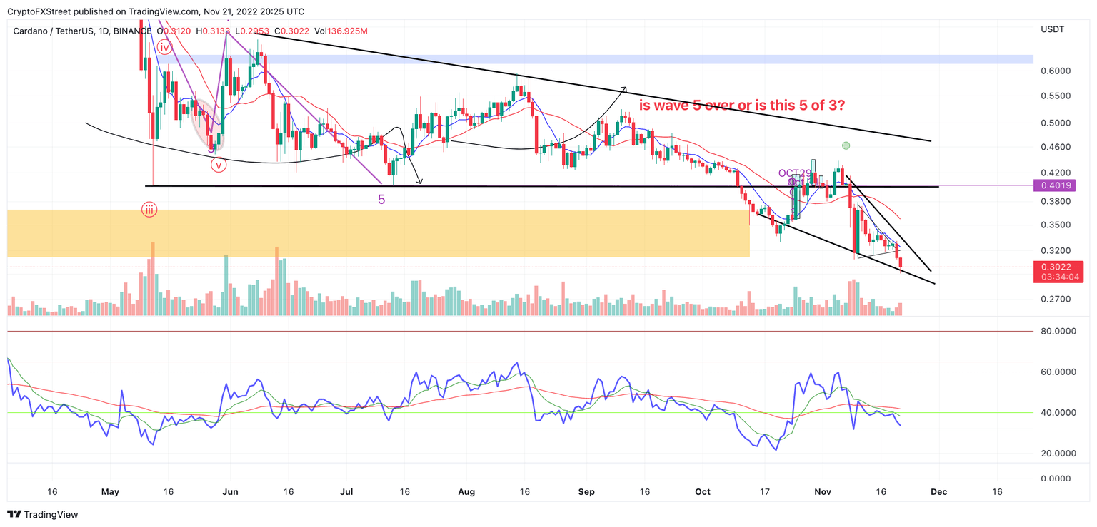 Cardano price is enduring a strong downswing that is aiming to wipe out long-term investors' profits and liquidity. If market conditions persist, the smart contract token will continue to decline in the days to come. Key levels have been defined to gauge ADA's potential landing zones. Cardano price continues to pile on negative returns during November.