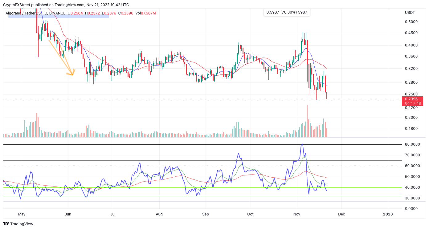 Algorand (ALGO) price is witnessing a severe decline on November 21. ALGO could print new two-year lows if market conditions persist. Key levels have been defined to gauge ALGO next potential move. Algorand price has declined by 47% since the start of November. During the downswings, the bulls have struggled to retaliate for more than a day or so before the bears initiate another attack.