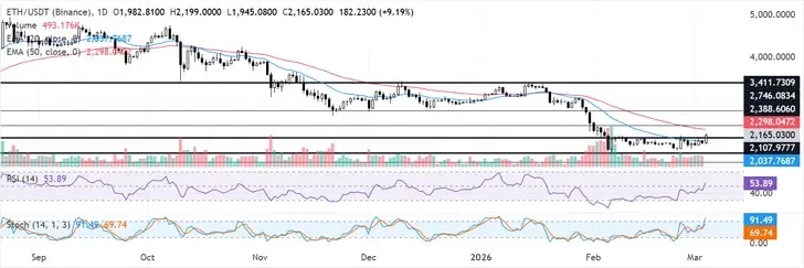 Ethereum (ETH) has jumped above $2,100 on Wednesday, following a general recovery across the crypto market. The move was accompanied by a spike in Ethereum's open interest (OI), which has increased to 13.43M ETH — its highest level since January 31. The top altcoin's OI has been rising since February 19, adding 1.2M ETH over the past two weeks. The growth comes amid $152 million in Ethereum liquidations over the past 24 hours, dominated by $129 million in short liquidations, according to Coinglass data.