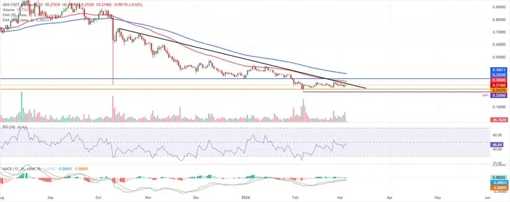 Cardano (ADA) price is approaching its descending trendline around $0.28 at the time of writing on Thursday, set to shape the next directional move. The derivatives metrics paint a bearish picture, with ADA’s Open Interest (OI) continuing to fall and short bets rising among traders. On the technical side, price action holds below the long-standing descending trendline, keeping the downside bias intact.