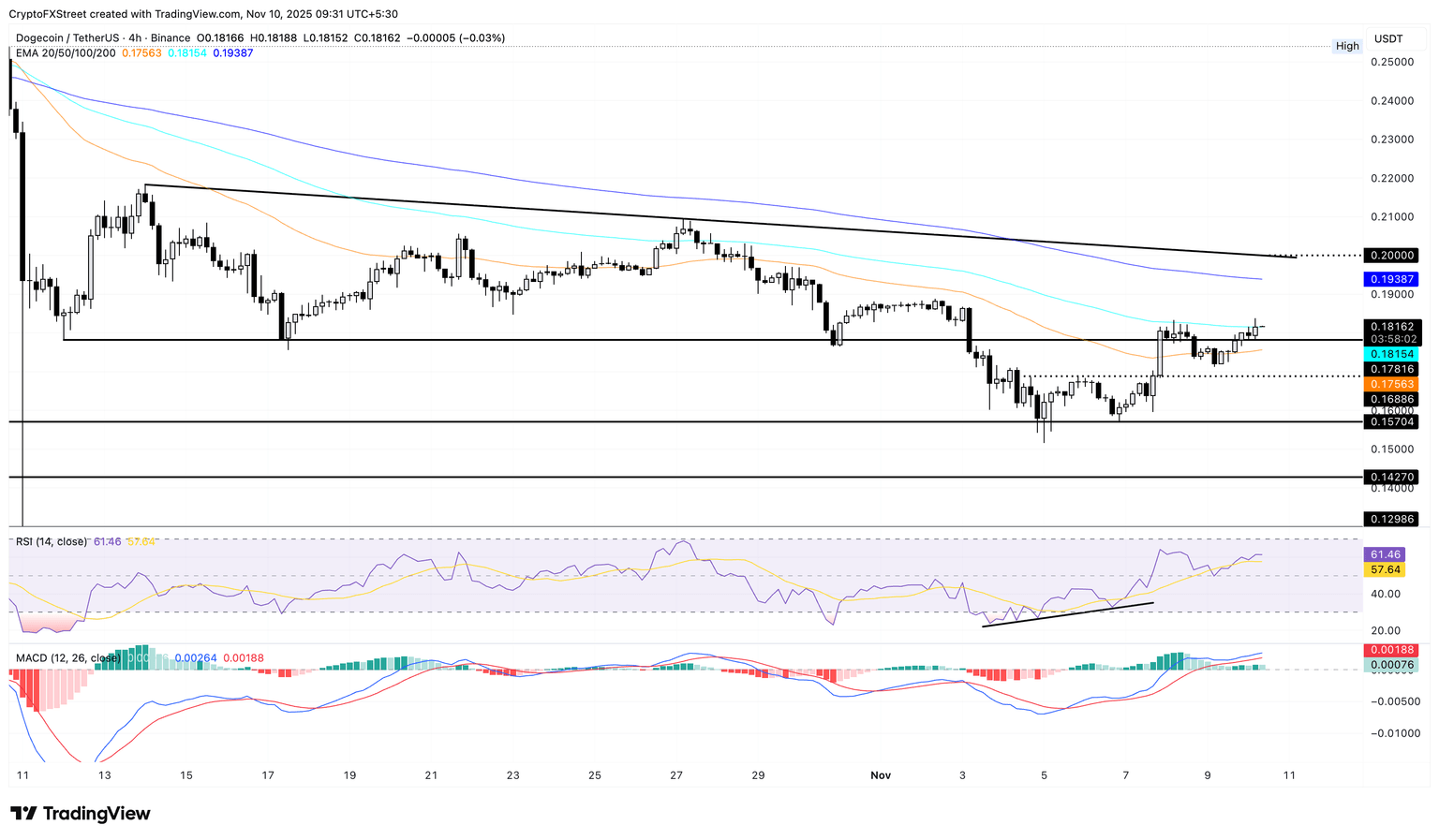 Dogecoin recovers above $0.1800 by press time on Monday, extending the nearly 2% gains from the previous day. DOGE’s double bottom reversal from $0.15704 support struggles to surpass the 100-period Exponential Moving Average (EMA) at $0.18154 on the 4-hour chart. If the meme coin successfully clears this dynamic resistance, it could test the 200-period EMA at $0.19386, followed by a descending trendline formed by connecting the October 14 and October 27 highs, near $0.20000 psychological mark.
