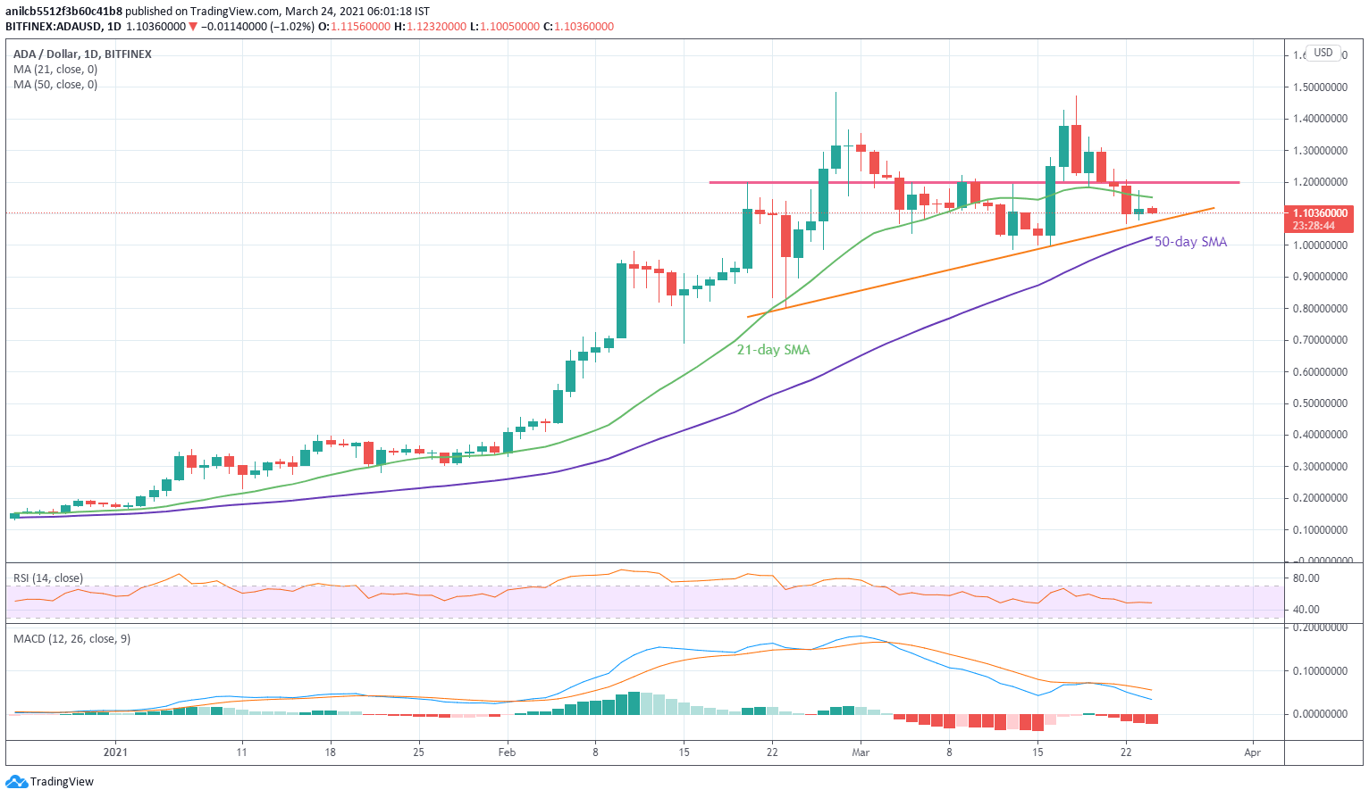 ADA/USD remains depressed below 21-day SMA, currently down 1.15% to $1.1022, during early Wednesday. In doing so, the cryptocurrency pair stays below the immediate SMA for the third day in a row. Five-week-old horizontal area adds to the upside filters, 50-day SMA tests bears as well.
