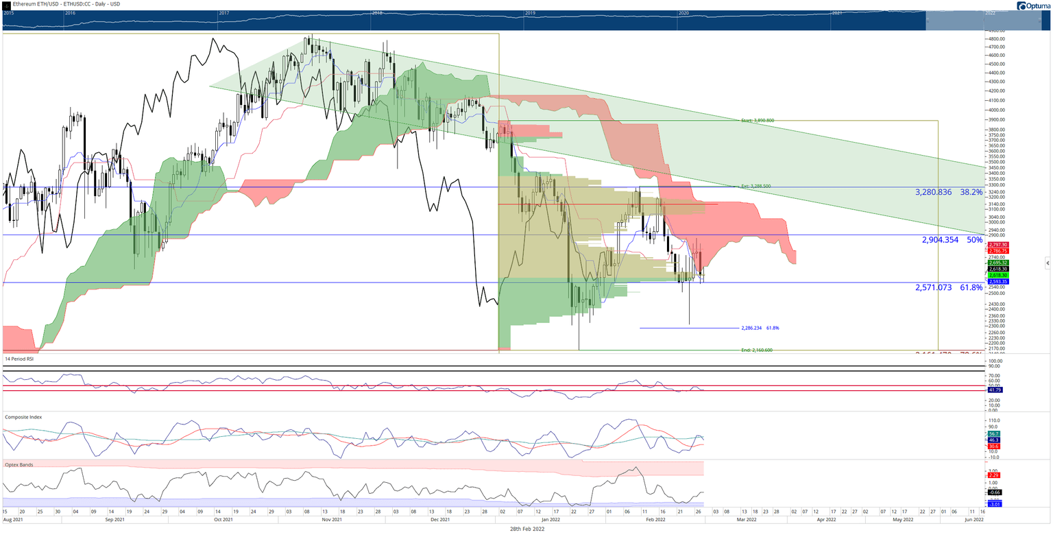 Ethereum price action showed some relief from near-term selling pressure by closing inside the Ichimoku Cloud this past Saturday. However, continued concerns over Russia’s invasion of Ukraine and the mention of nuclear weapons dropped ETH on Sunday to a loss of nearly 7%. However, despite the drop, ETH’s final support level has held.