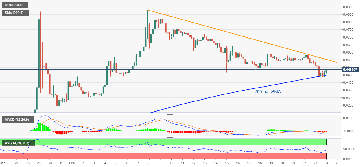 DOGE/USD holds on to the previous bounce-off key SMA while picking up bids near 0.0480 during early Wednesday. The altcoin recently picked up bids as RSI bounces off oversold territory. RSI recovery from oversold area backs the latest run-up.