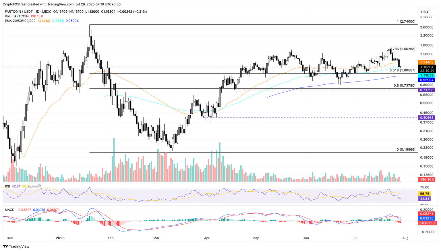 Fartcoin (FARTCOIN) edges lower after a nearly 14% drop on Monday, outpacing the broader market pullback in the last 24 hours. The meme coin holds above the 100-day Exponential Moving Average (EMA) as the rising bearish momentum risks a potential retest of the $1 psychological level.