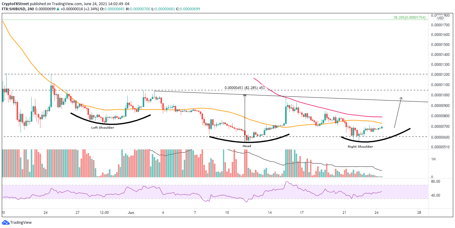 Shiba Inu price did test the May 19 low again earlier this week but did rebound before testing the June 11 low, establishing the low point of a potential inverse head-and-shoulders pattern. The ongoing rebound has been tentative, suggesting a mild pullback before starting a rally towards the pattern’s neckline. With two four-hour moving averages haunting price, practicing patience and letting the SHIB right shoulder develop is advisable.