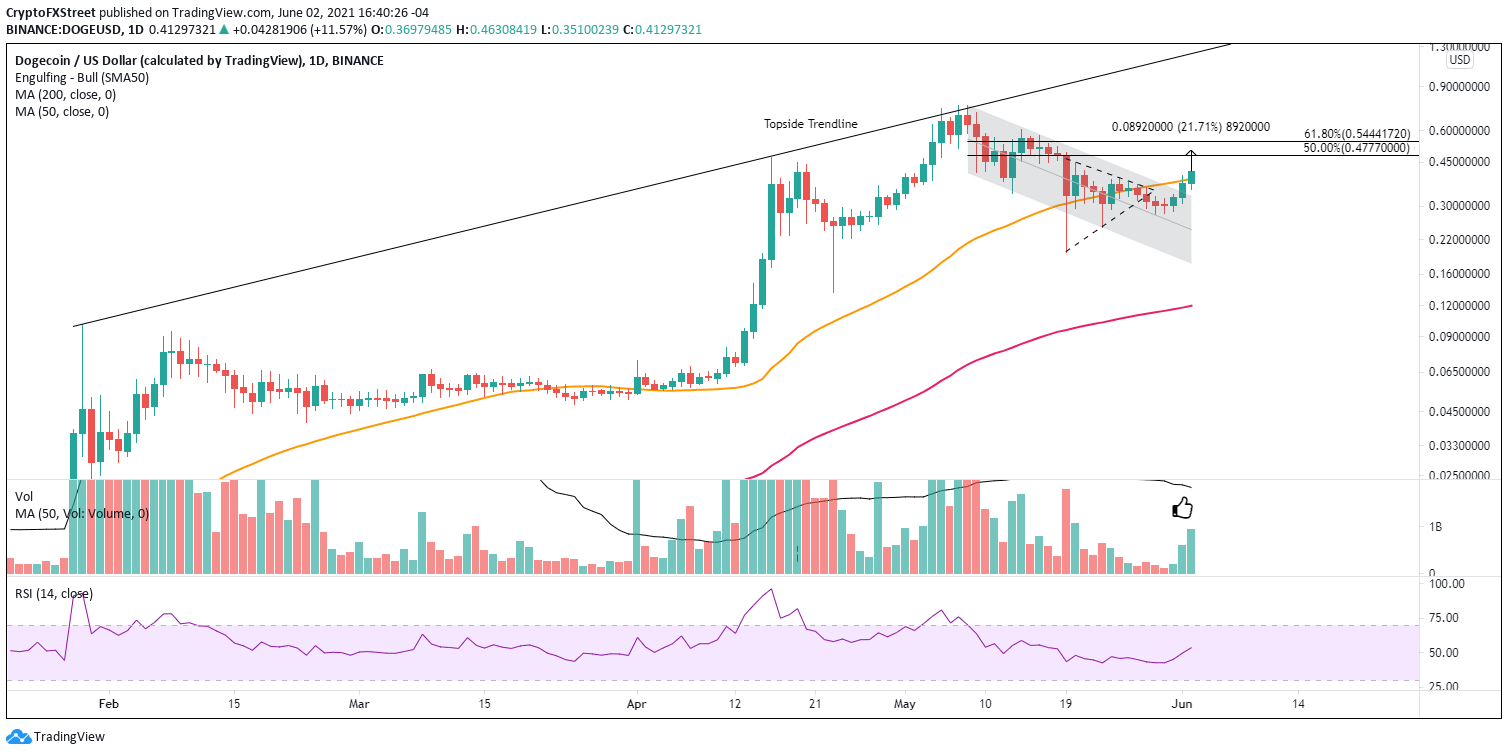 Dogecoin price combines two double-digit days to release from the descending channel that has governed price since May 8. The absence of overbought conditions on the daily or weekly Relative Strength Indexes (RSI) positions DOGE to build on the breakout towards the measured move target.