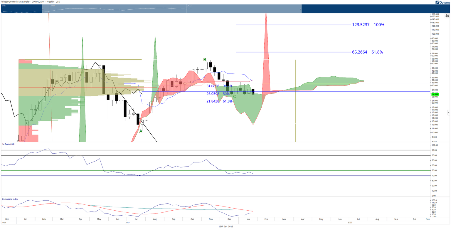 Polkadot price could be one of the earlier and biggest movers in any broader cryptocurrency return to bull market conditions. The setup on the $2.00/3-box reversal Point and Figure chart is an epic combination of bear traps. Polkadot price continues to face significant resistance in the low $30 price ranges.