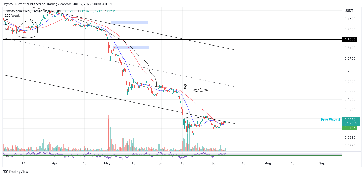Crypto.com price shows trend-rallying signals to begin the month of July. Placing a short-term bullish trade is justifiable for these reasons. Crypto.com price could awaken bulls to meet at the table as a bullish engulfing candle has recently breached through the $0.11 barrier, long subdued by a descending parallel channel.